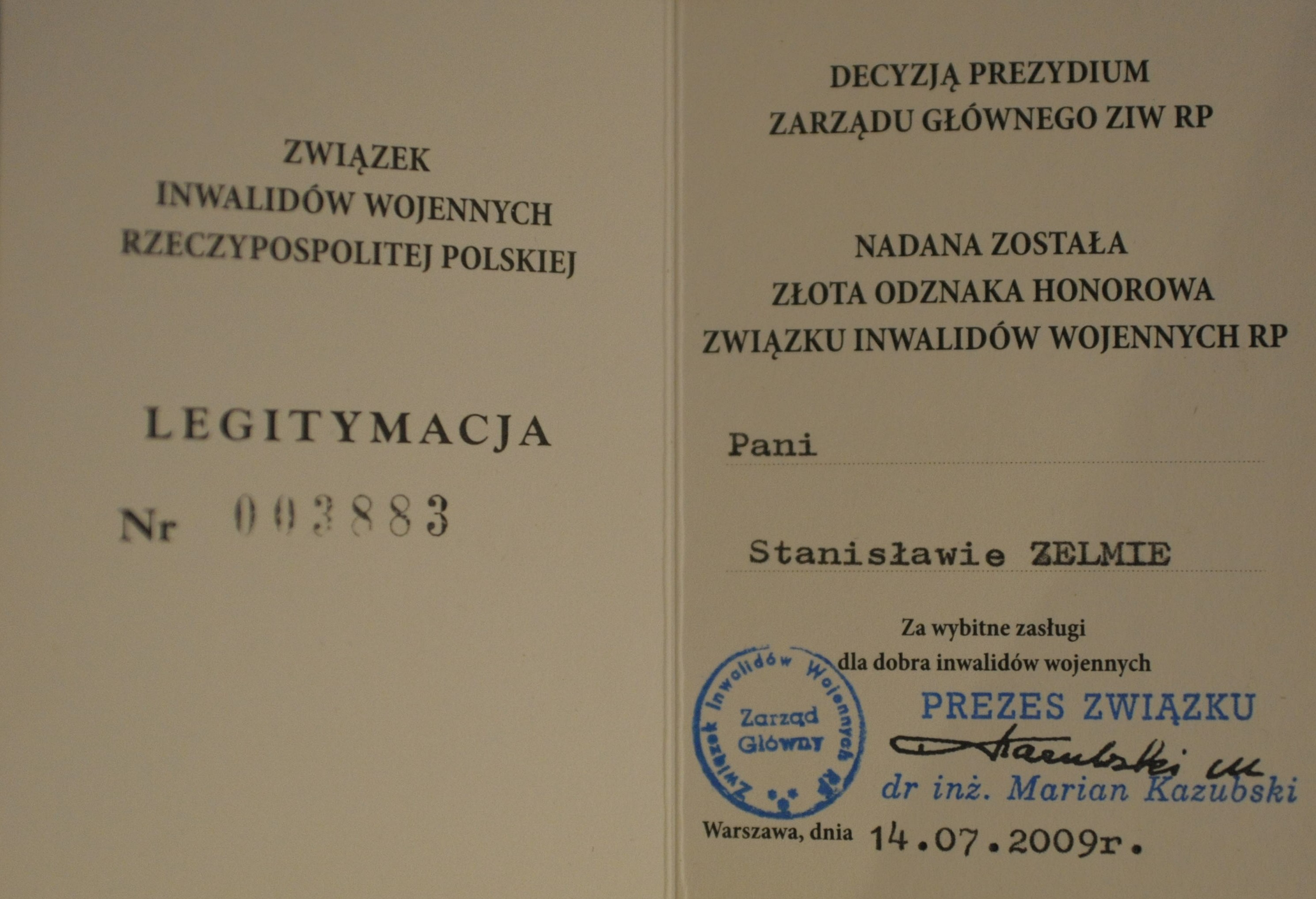 Legitymacja Złotej Odznaki Honorowej Związku Inwalidów Wojennych RP, Warszawa 14.07.2009