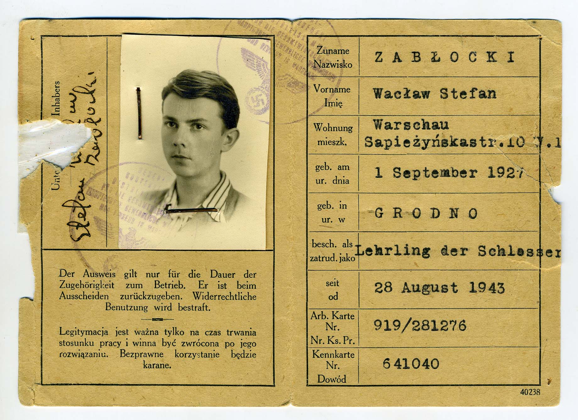 Kenkarta Zbigniewa Grochowskiego wystawiona na okupacyjne fałszywe nazwisko Wacław Stefan Zabłocki -